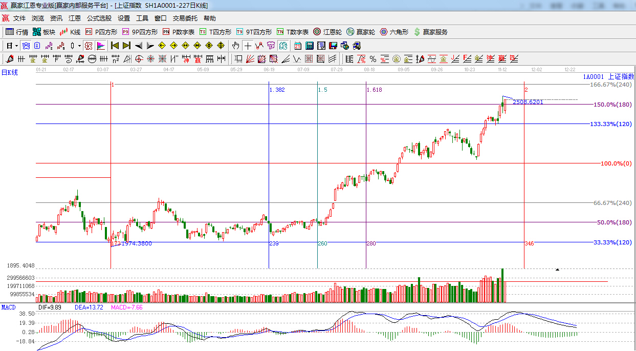 江恩看盤綜述:依據贏家江恩技術工具分析得出:上證指數低開高走,以中陽線報收,收復江恩180度2480點,但量能較昨日大幅減少,后期若無量能跟隨,短期維持在2500點附近形成強勢震蕩行情難以避免,短線依然留意180度2480點的得失,本月重要時間窗口在11月24日。