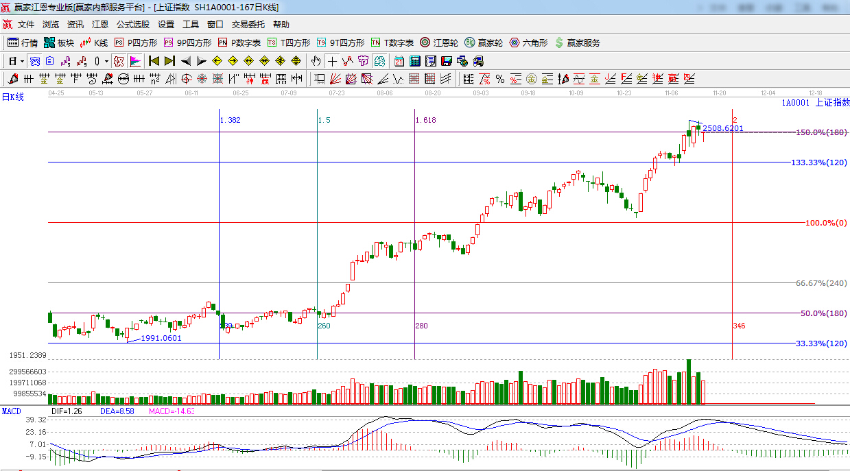 ☆依據贏家江恩系統波段百分比提示:破位180度2480點,隨后小幅回升,周一繼續關注180度的爭奪,下方支撐是120度是2410點,上方強阻力240度是2550點。