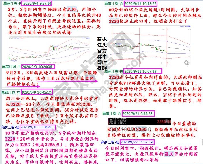 2020年一季度大盤反復摔打創年內低點2646點、二季度小碎步攀升、三季度強勢上攻隨后轉入修整,四季度行情拉開序幕、蓄勢待發。8、9月份市場在箱體區間內運行,贏家江恩團隊在正式學員群提前給出箱體策略,原話如下“在一個箱體區間里做滾動交易--底倉+活動倉,不會輕易的去追漲,而是對持續跟蹤的標的(日或周強勢區域)調整幾天后用活動倉參于,上漲到別人想追時賣出。”學員可在群中搜索“箱體”回顧提出時間進行思考,為何能提前于市場走勢之前就提出相應的策略?當你你又是如何打算的呢?后知后覺者永遠是賣單者,大家看看自己的賬戶,是不是9月份把今年賺的都還給市場了,其中應該不少人8月份就還了利潤,9月份還虧了本金。如這樣都不能讓你明白,擁有一套“投資體系”的重要性,那再來一波牛市,賺的錢最終也不是你的。如果你跟隨專業的團隊進行學習,在9月初2號、3號時間窗口,提醒降低倉位時控制倉位,不僅保住了利潤還可以根據工具信號在9月11日3220時價點做一個反彈,同樣贏家江恩團隊提前測算出3350壓力,9月底指數再探3200附近,分鐘圖再現時價四方信號。
