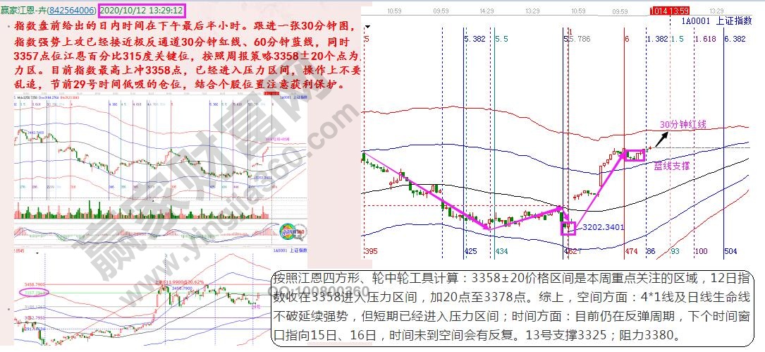 對照當下回顧歷史,在提前預測和實際走勢的對比中,學習感悟江恩時空技術的魅力。12日大盤分析,指數到達預期關鍵位3358點,進入壓力區間。但,日線時間并未走完,空間還有反復,不破3325點仍屬強勢,可繼續把握個股機會。實則,13日指數直接低開下探,回踩日線生命線3330一線后,止跌回升再次沖擊3358。全天呈震蕩態勢,符合預期分析,等待日線下個時間窗。