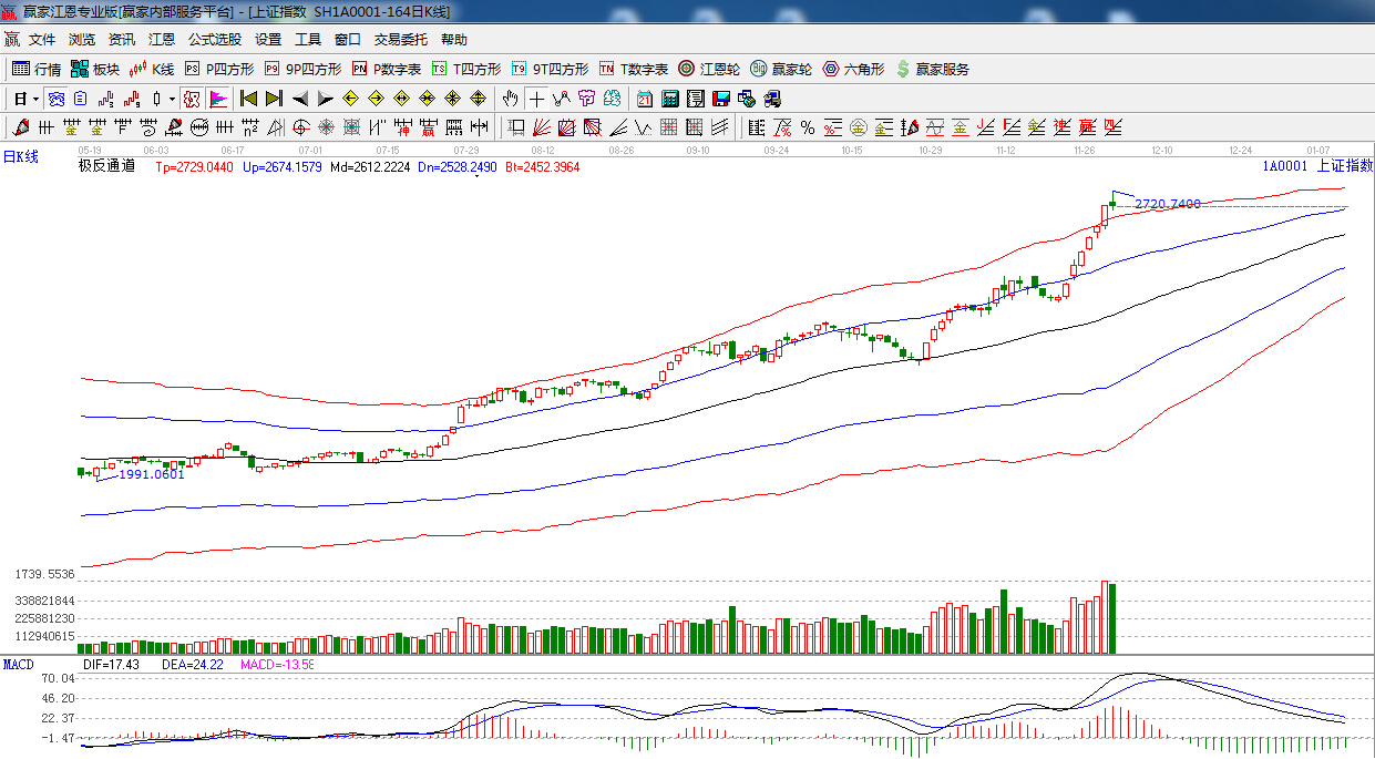 極反通道提示:超強外軌線之外,沖高回落,陰十字星報收,此時謹慎為主,隨時注意回調風險。