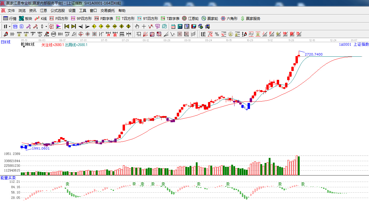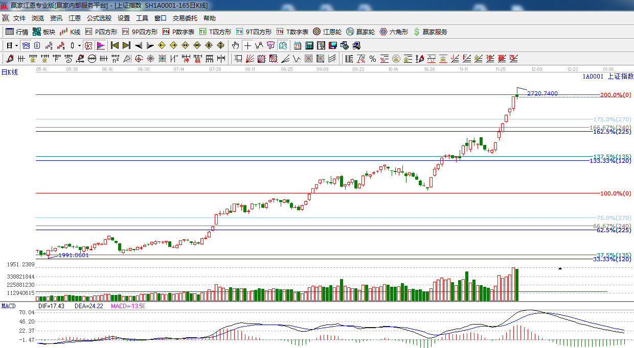 江恩看盤綜述:依據贏家江恩技術工具分析得出:上證在200%位置沖高回落,陰十字星報收,量能依然保持高水平,明日關注200%,2692點的爭奪,線上看多,線下看空,預計本周指數整體以高位震蕩為主,操作上,一線藍籌切莫追漲,可適當關注低位具有估值優勢的板塊和個股
