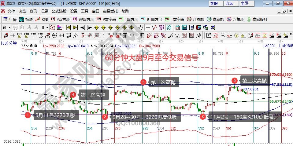 11月2號60分鐘周期在空間工具180度3210點(diǎn)獲得支撐,盤中解讀按此信號市場有反攻需求,6號倍數(shù)時(shí)間與百分比240度3289點(diǎn)形成共振,再度解讀反攻空間拓展至藍(lán)色上軌線,10號高開完成上攻空間開始震蕩回落。按贏家江恩投資體系十六字真言“看大做小、看長做短、牛長熊短、紅肥綠瘦”,市場遇阻回落最先要確認(rèn)的周期及支撐信號是什么?60分鐘懸空應(yīng)當(dāng)如何判斷次日市場拐點(diǎn)?相信聽過關(guān)于周期關(guān)系推導(dǎo)、極反通道應(yīng)對技巧的贏家學(xué)員,對這兩個(gè)問題心中都有評判的標(biāo)準(zhǔn)與答案,也會理解為何盤前直接鎖定到30分鐘周期,并且指定關(guān)鍵位是生命線,今日指數(shù)正好預(yù)期位收盤,聰明的投資者按此信號做尾盤交易,明天盤中就可擇機(jī)獲利高拋。先人一步抓住市場機(jī)會。