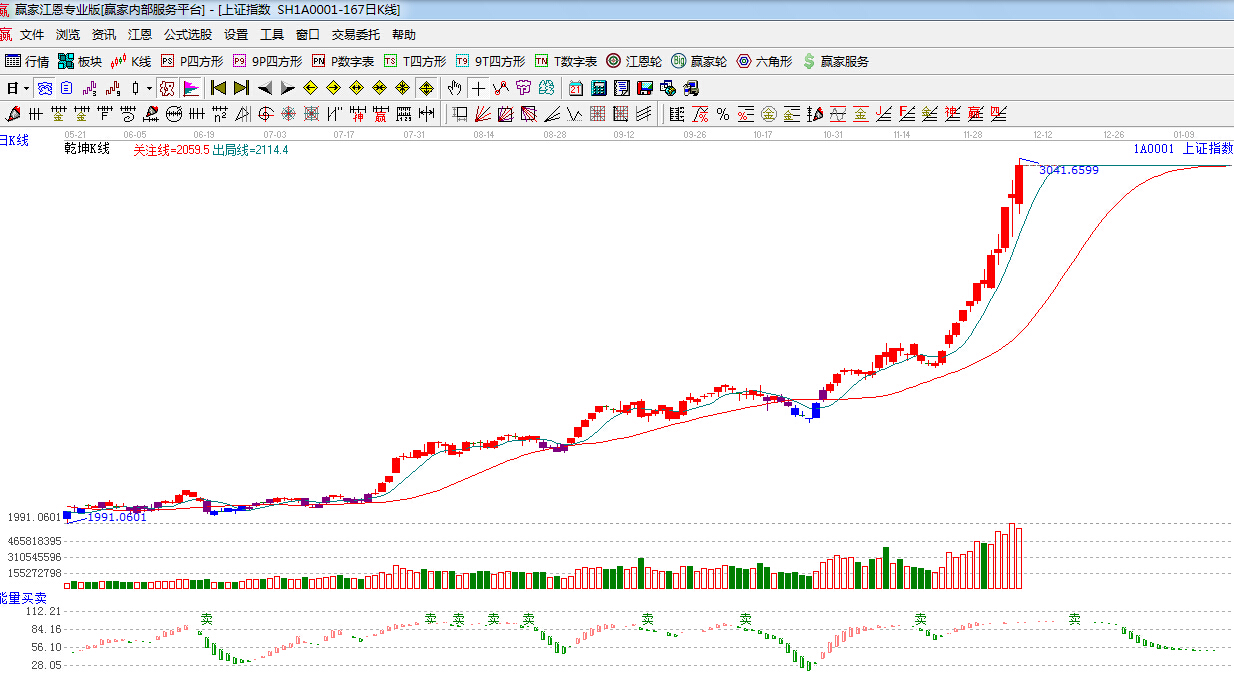 江恩看盤綜述:依據贏家江恩技術工具分析得出:指數繼續放量拉升,最高3041點,收盤3020點,量能保持強勢,對于指數而言,短線不排除還有可能震蕩創新高,但上方將面臨強阻力區間3038點—3111點,所以后半周短線震蕩或加劇,操作上,適當拋售漲幅過大的品種,重視低估藍籌股的補漲機會,例如受政策刺激的軍工、高鐵、金融等板塊。