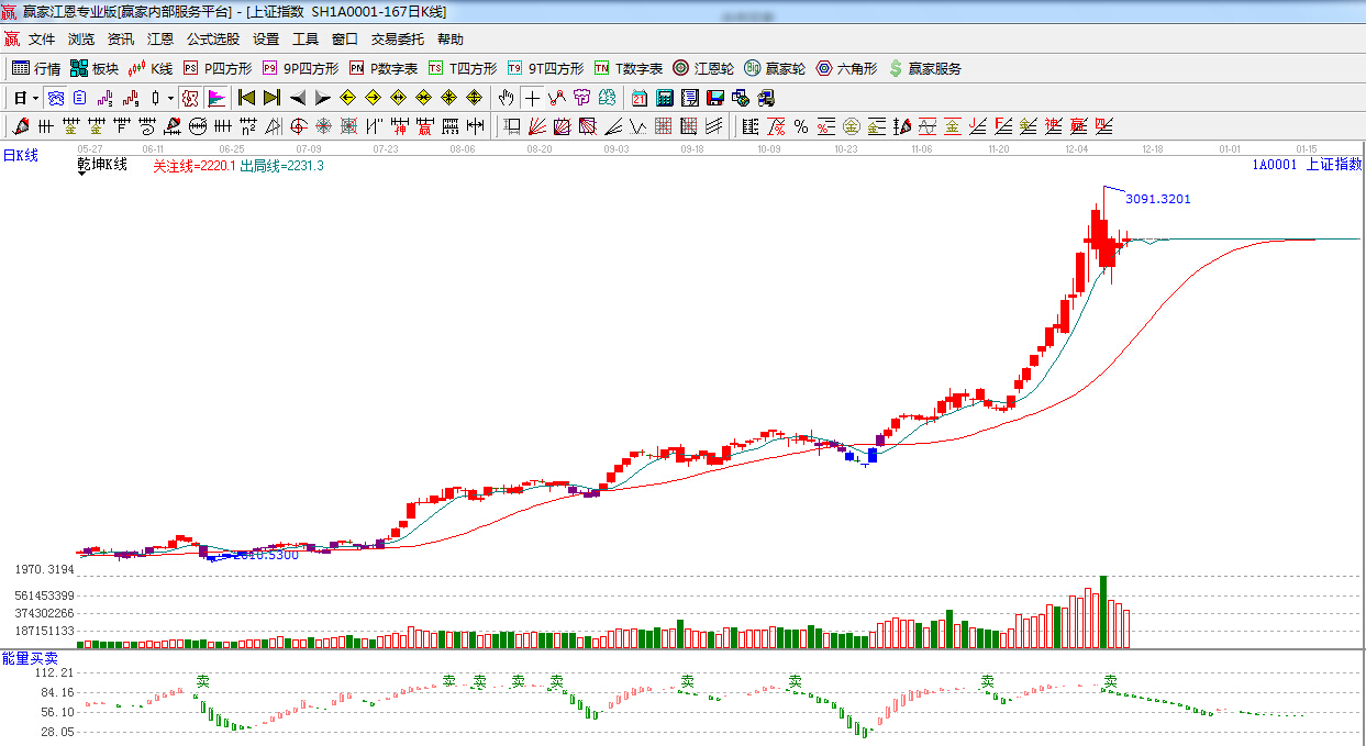 ☆依據贏家江恩系統能量買賣提示:綠色看空能量柱出現,短線看空,謹慎為主。