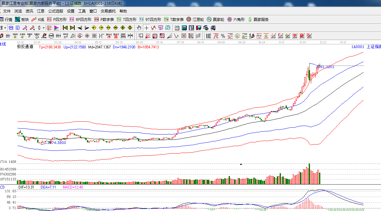 極反通道提示:指數沿紅色外軌線,繼續震蕩走高,依據規則外軌線不破,整體看多趨勢不變。