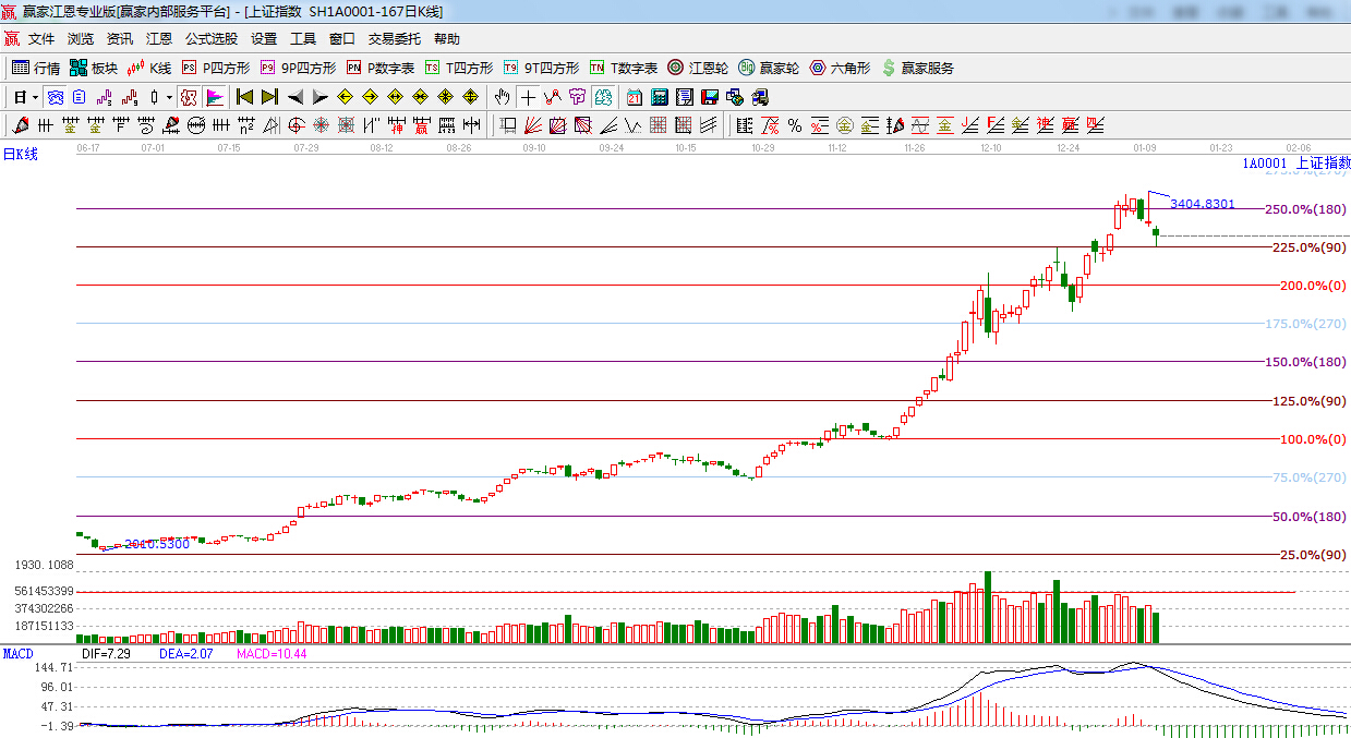 江恩看盤綜述:依據贏家江恩技術工具分析得出:今日滬深兩市表現疲弱,滬指低開下探江恩90度3188點支撐,隨后維持低位震蕩,金融股嚴重分化,題材股活躍,江恩90度支撐3188點,此位置不破,短期高位震蕩格局有望延續。但整體大勢依舊向好,操作上,合理控制倉位,繼續關注國企改革、一帶一路等近期熱點,另外,傳媒、軍工等題財股也可適關注。