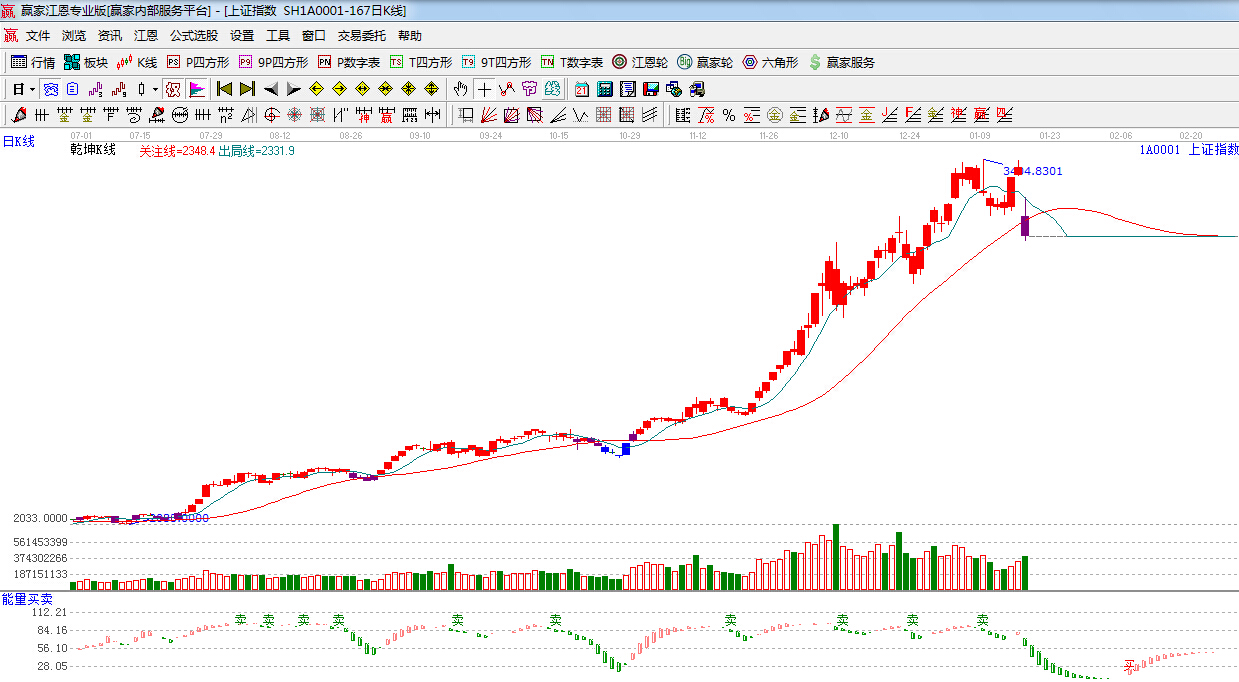☆依據贏家江恩理論系統乾坤K線提示:日k線由紅色轉入紫色k線破位紅色關注線,紫色k線是警示k線,所以短期謹慎為主。