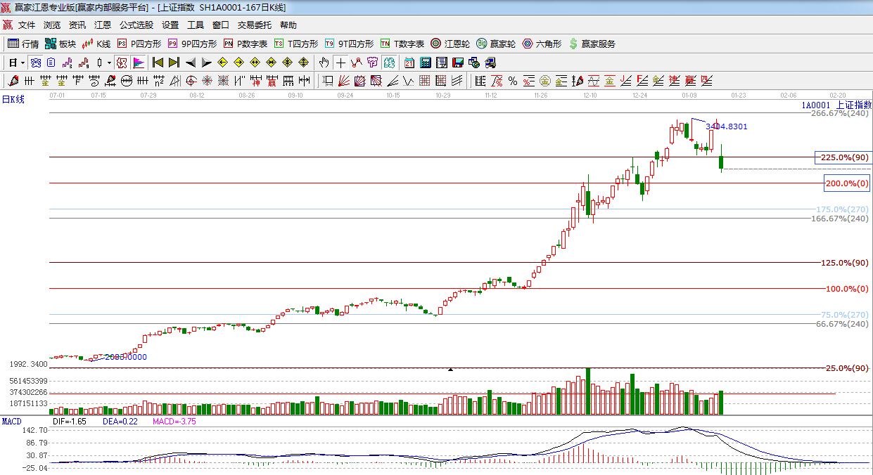 今日市場受利空消息影響,滬深兩市出現大幅下挫,權重股中的券商,銀行,保險等全線跌停,煤炭、石油等權重板塊也大幅下跌,截至收盤,滬指跌7.70%報3116點;深成指跌6.61%報10770點。盤面上,兩市個股超2000只下跌,市場人氣遭受重創,技術面,今日盤面上的重挫是市場強勢上漲過程中的震蕩,需冷靜面對,按照江恩百分比分析:滬指盤中破位江恩90度3188點,明天下方支撐位是江恩0度位置3039點附近,加之明天是節氣“大寒”的時間窗口,滬指將會在江恩0度支撐附近止跌回穩,然后重新步入前期的強勢,但券商等權重股走勢或將暫告一段落,指數后期將呈現震蕩上行的慢牛格局。市場熱點將會轉入中小盤。