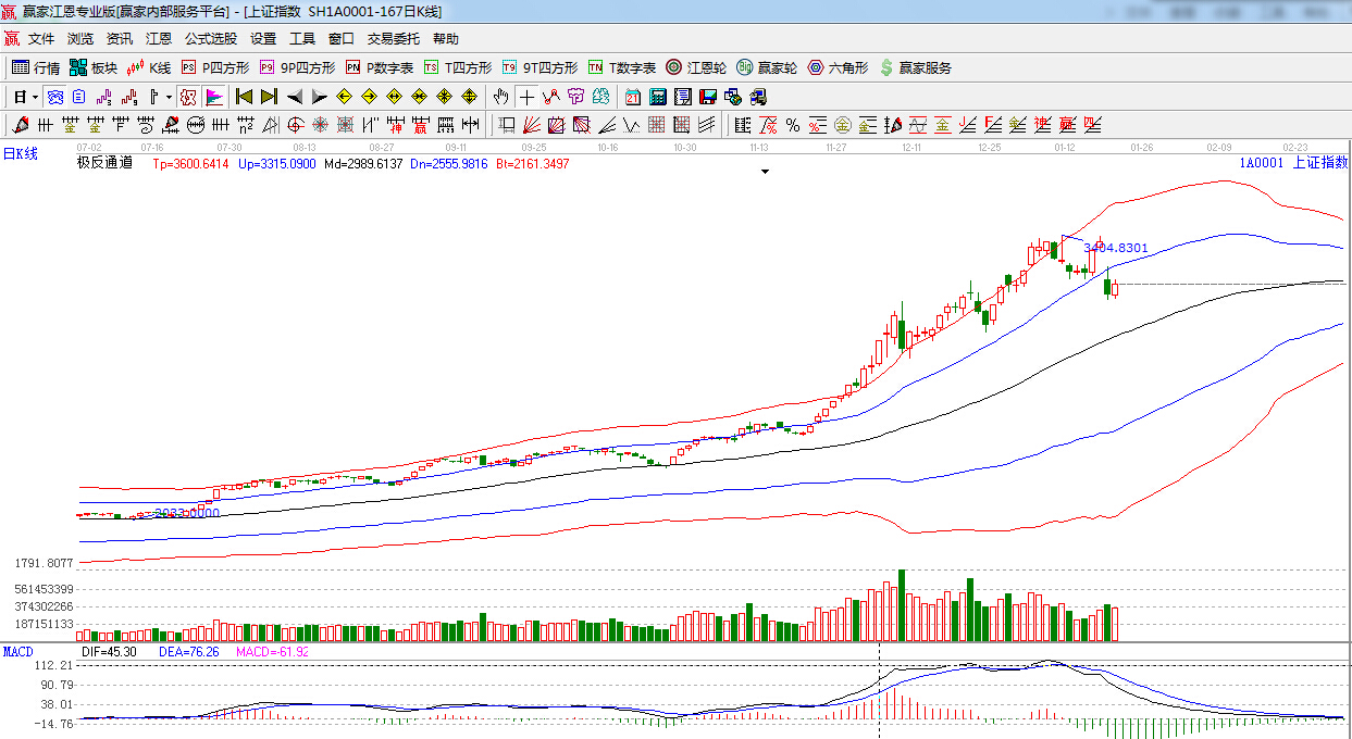 極反通道提示:滬指低開震蕩反彈,短線阻力位藍色外軌線,外軌線3270點。