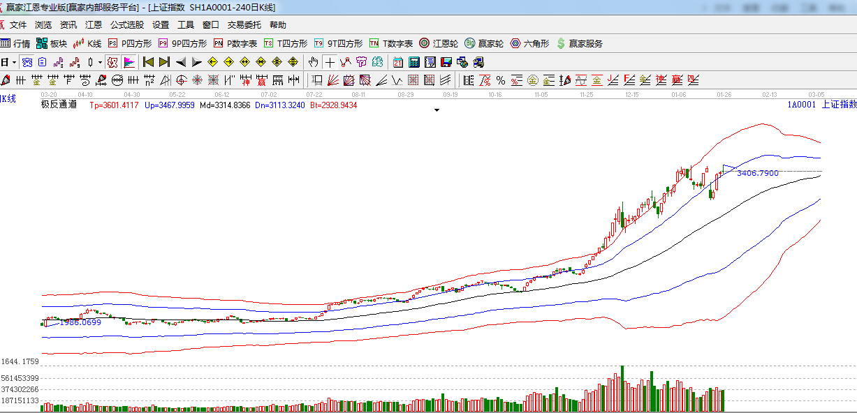 極反通道提示:滬指繼續圍繞在極反通道藍色外軌線上方震蕩整理,外軌線支撐3303點,此位置不破,看多。