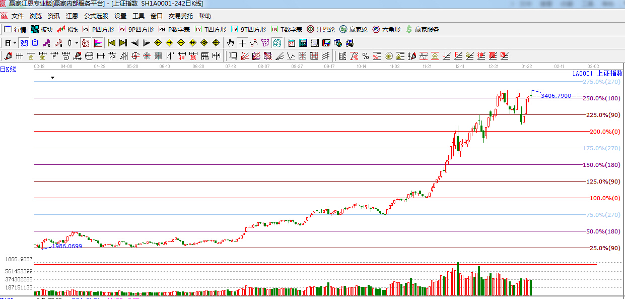 ★依據贏家江恩理論系統波段百分比提示:滬指圍繞180度之上震蕩,終盤十字星報收,180度3337點此位置不破繼續看多,上方目標位江恩270度3486點,下方的90度支撐3188點。