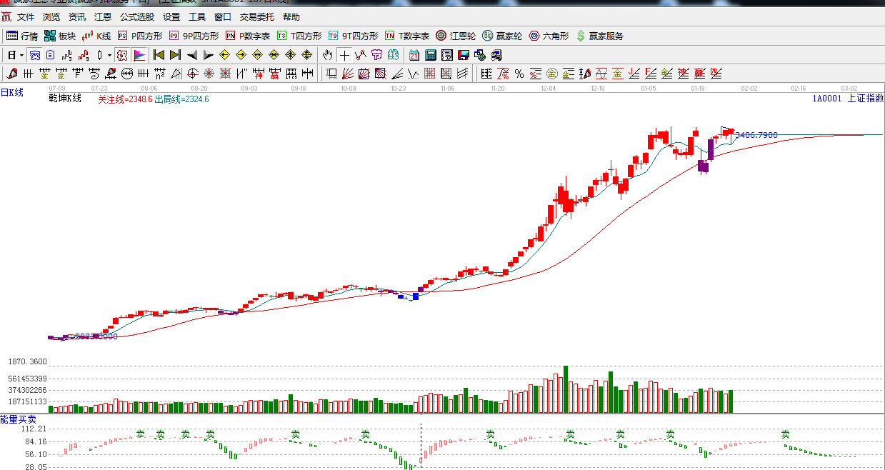 ★依據贏家江恩理論系統乾坤K線提示:紅色區域,短線出局線之上,短線出局線不破,看多。