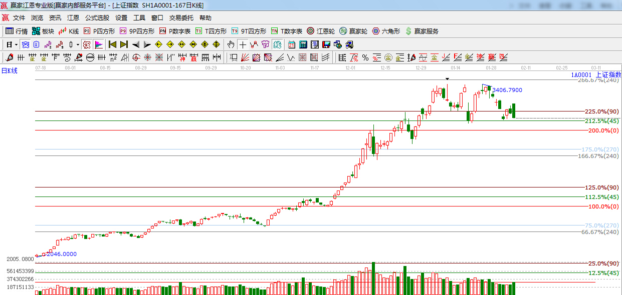 ☆依據贏家江恩理論系統波段百分比提示:高開回落,收盤破位江恩90度3188點,下方支撐是,江恩45度3114點,江恩0度位置3039點。