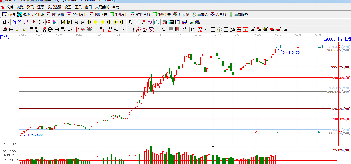 江恩理論系統(tǒng)波段百分比提示:滬指向上突破,江恩240度3436點(diǎn),明天留意歷史高點(diǎn)3478點(diǎn),和江恩270度3486點(diǎn)重合。