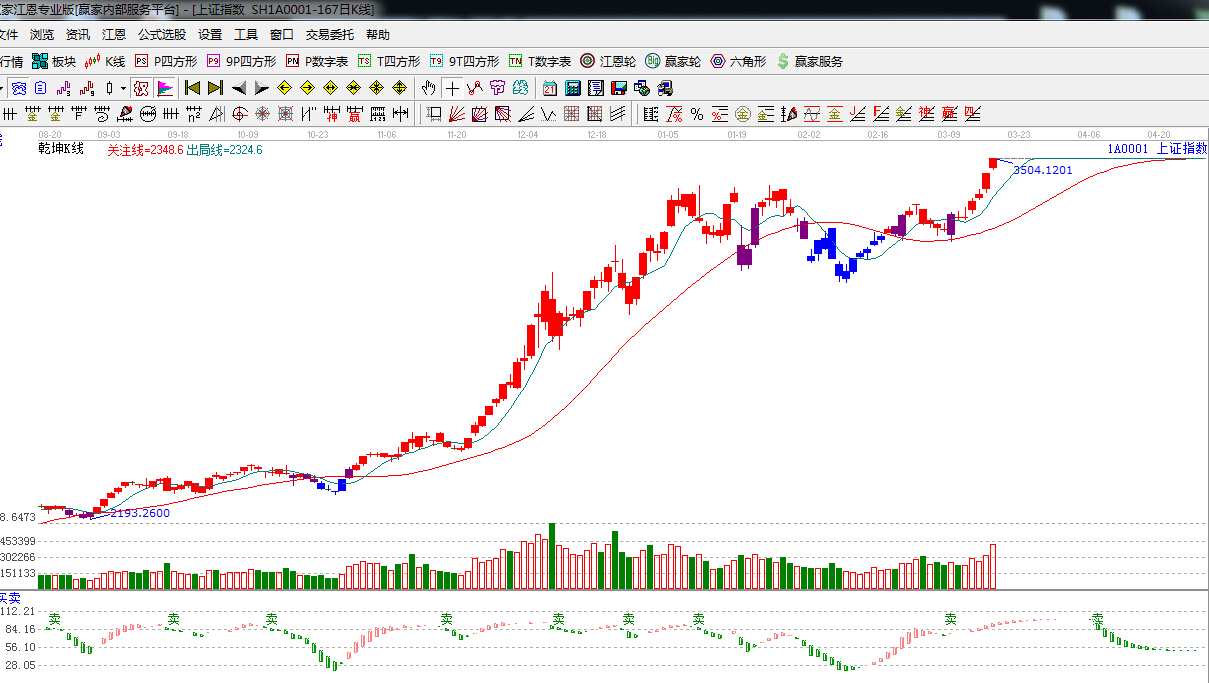★依據贏家江恩理論系統乾坤K線提示:紅色k線,可操作區域,趨勢看多。
