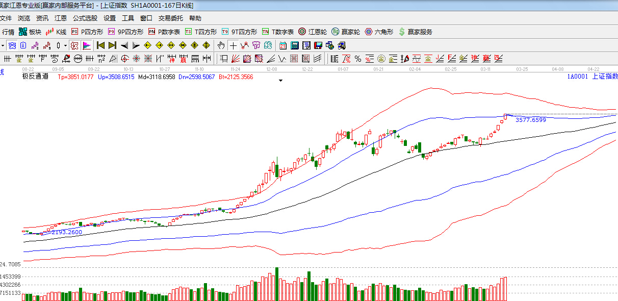 極反通道提示:今日滬指高開高走,午盤突破藍(lán)色外軌線3551點(diǎn),明日考驗(yàn)藍(lán)色外軌線支撐有有效性,短期看多。