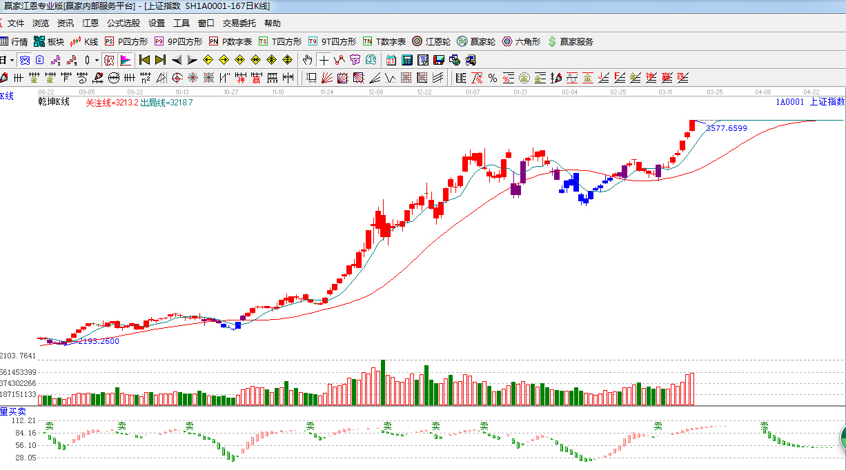 ★依據(jù)贏家江恩理論系統(tǒng)乾坤K線提示:紅色k線,可操作區(qū)域,趨勢看多。
