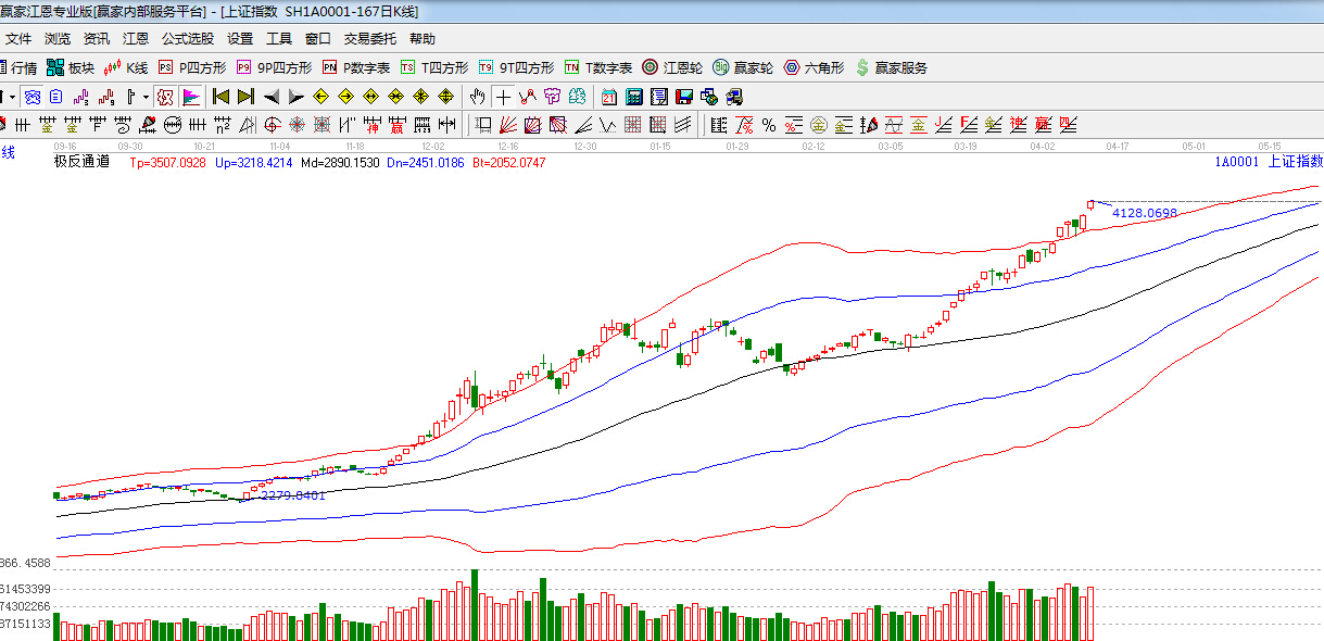 極反通道提示:極反通道紅色外軌線支撐上方,繼續走強,強勢格局延續。
