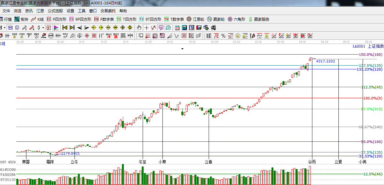 盤面上看,海工裝備、交運設備、海洋經濟、港口水運、鐵路基建等板塊漲幅靠前,免疫治療、人工程、食品安全、基因測序等板塊跌幅領先。另外,全天有逾70只非ST股漲停,近日連續百點長陽,預示著大盤的瘋狂才剛剛開始,依據江恩百分比分析江恩120—135度(4082--4157)位置轉換為支撐,此位置不破將繼續看高,下一目標位是江恩180度4384點,225度4611點,近期時間窗口是谷雨4月20日。操作上,建議投資者利用盤中震蕩機會,逢低介入近期漲勢相對落后的國資改革、業績超預期個股。