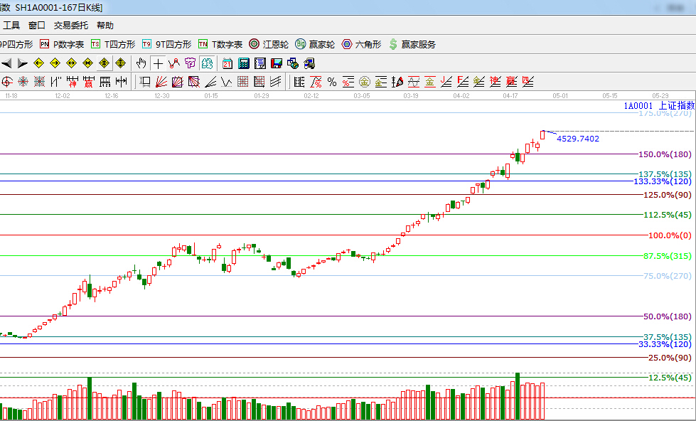 ★依據(jù)贏家江恩理論系統(tǒng)波段百分比提示:江恩百分比180度4300點附近支撐線,此位置不破整體趨勢不變,上方下一目標位是270度,4700點附近。