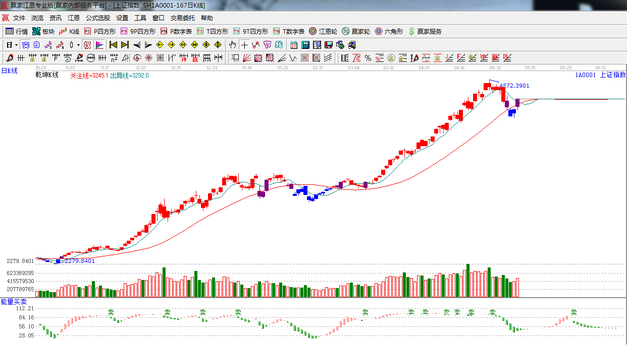 ☆依據贏家江恩理論系統乾坤K線提示:k線有藍色轉變為紫色警示k線,重新收回紅色關注線,短期謹慎看多。