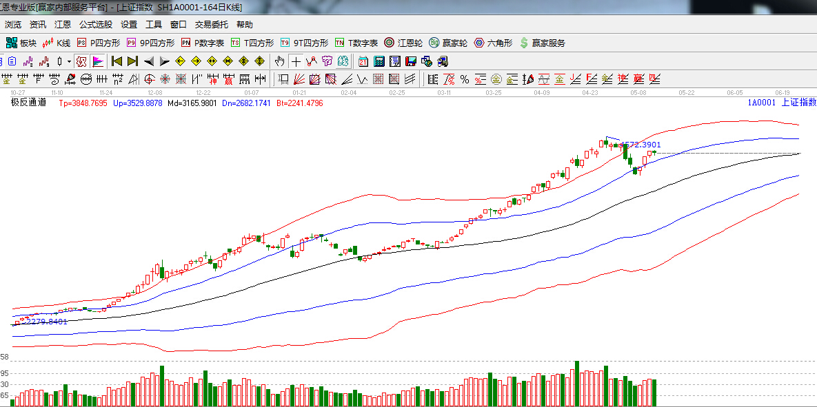 極反通道提示:滬指圍繞藍色外軌線震蕩,藍色外軌線轉換為支撐,此位置不破,趨勢看多。