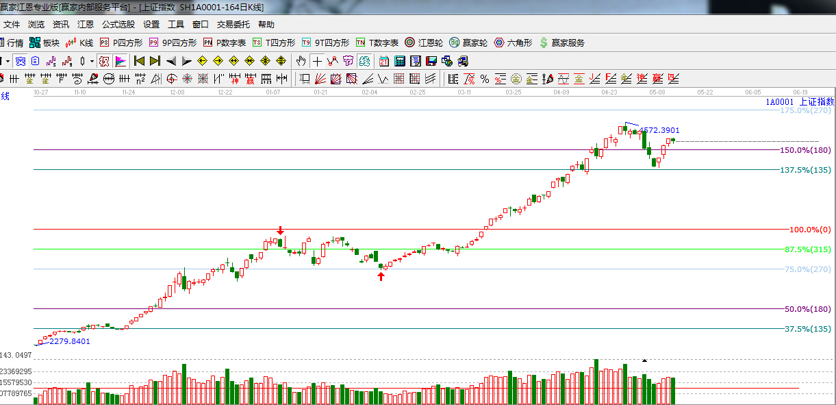 ★依據贏家江恩理論系統(tǒng)波段百分比提示:滬指如期在江恩135度4088點附近,止跌回升,突破180度4300點,4300點轉換為支撐位置。