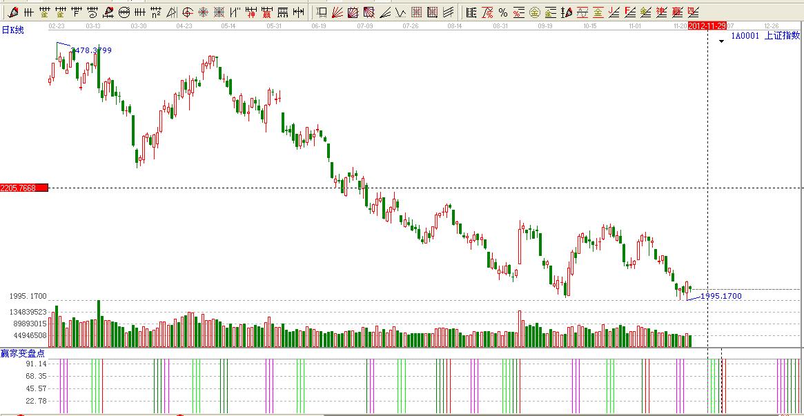☆依據(jù)贏家江恩系統(tǒng)乾坤k線提示:大盤還是處于藍色區(qū)域,看空信號。