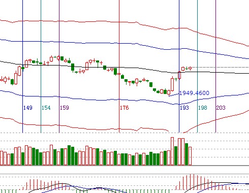 指數運行在生命線附近,日線進入周初通過時間工具提示的時間窗口,近兩個交易日震蕩確認生命線有效性為主,整理回落過程中不破生命線投資者可結合工具支撐做操作計劃,日線生命線支撐2060-2065,外軌線阻力2093-2106;