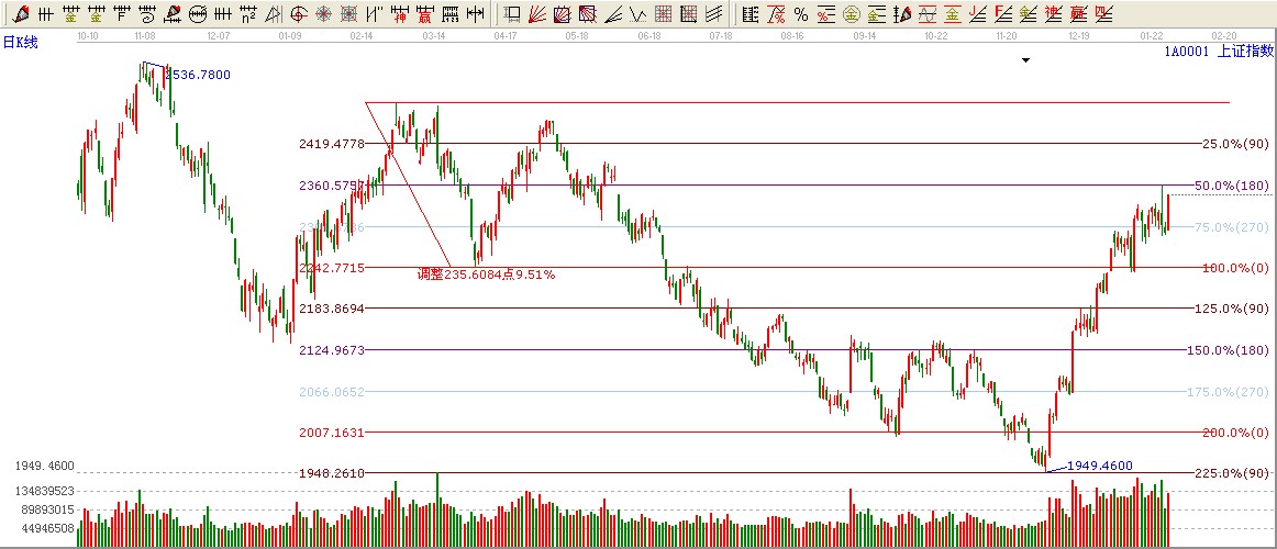 ★依據贏家波段百分比伸線提示:大盤270度位置長陽拉起,目標壓力依然是180度位置2362附近,只有突破180度位置才會看高一線至90度位置。