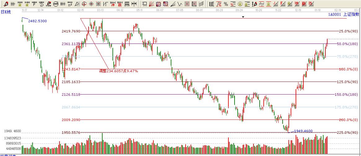 ★依據(jù)贏家波段百分比伸線提示:大盤收盤在180度2360壓力上方,短期壓力變支撐。只要不破這里才會看高至90度位置2420附近。