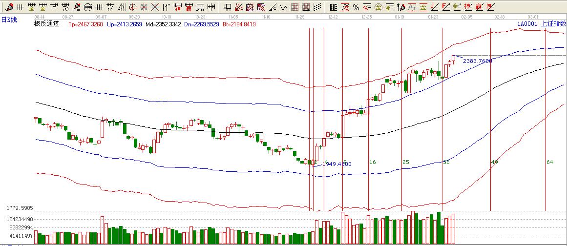 綜上所述:極反通道藍(lán)色上軌位置不破,按照極反通道應(yīng)用法則看高一線至2420附近。這里跟波段延伸線90度位置形成共振壓力。短期180度位置2360成為短期強支撐。