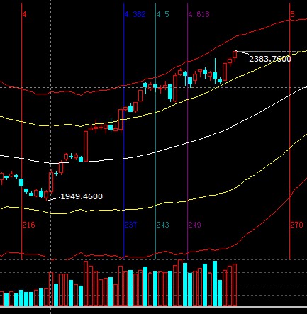 大盤延續強勢通道運行,短周期黃色外軌線區域是2390附近,整體做多觀點不變,通過提升止損位保護收益或倉位上做高拋低吸降低成本,短期支撐2360-2370,阻力2390-2400;