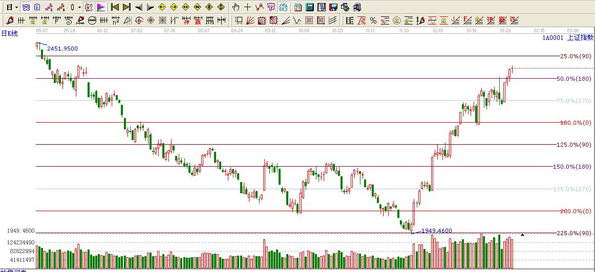 ★依據贏家波段百分比伸線提示:大盤依然運行在在180度2360壓力上方,構成短期支撐。只要不破這里看高至90度位置2420附近。