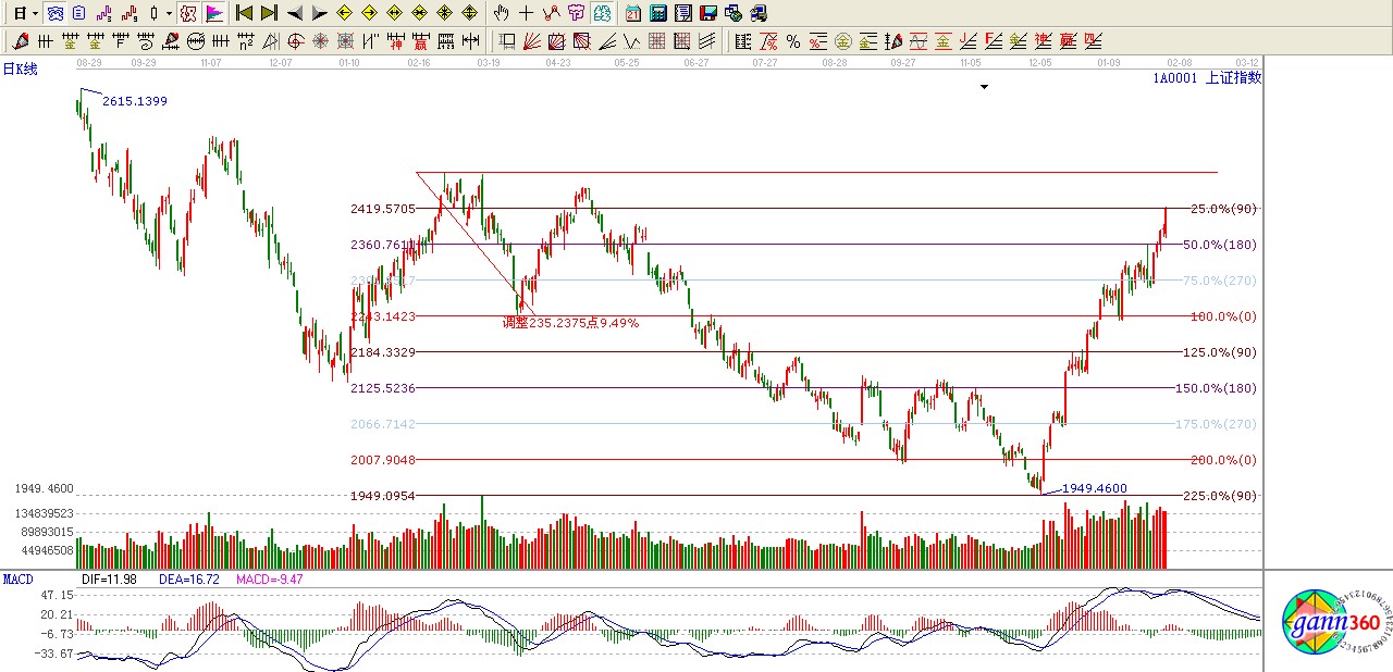 ★依據(jù)贏家波段百分比伸線提示:大盤處于90度位置附近沖高震蕩難免,0度位置是2478點(diǎn)。