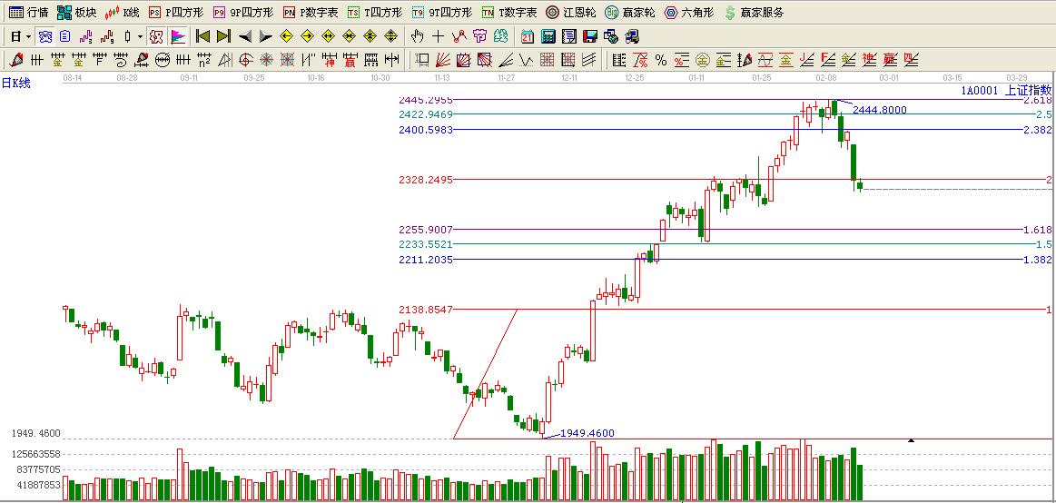 ☆依據贏家黃金價格延伸線提示:大盤如期跌至黃金分割延伸線2倍位置,短期構成壓力,這里不過看低一線至1.618位置2255附近.