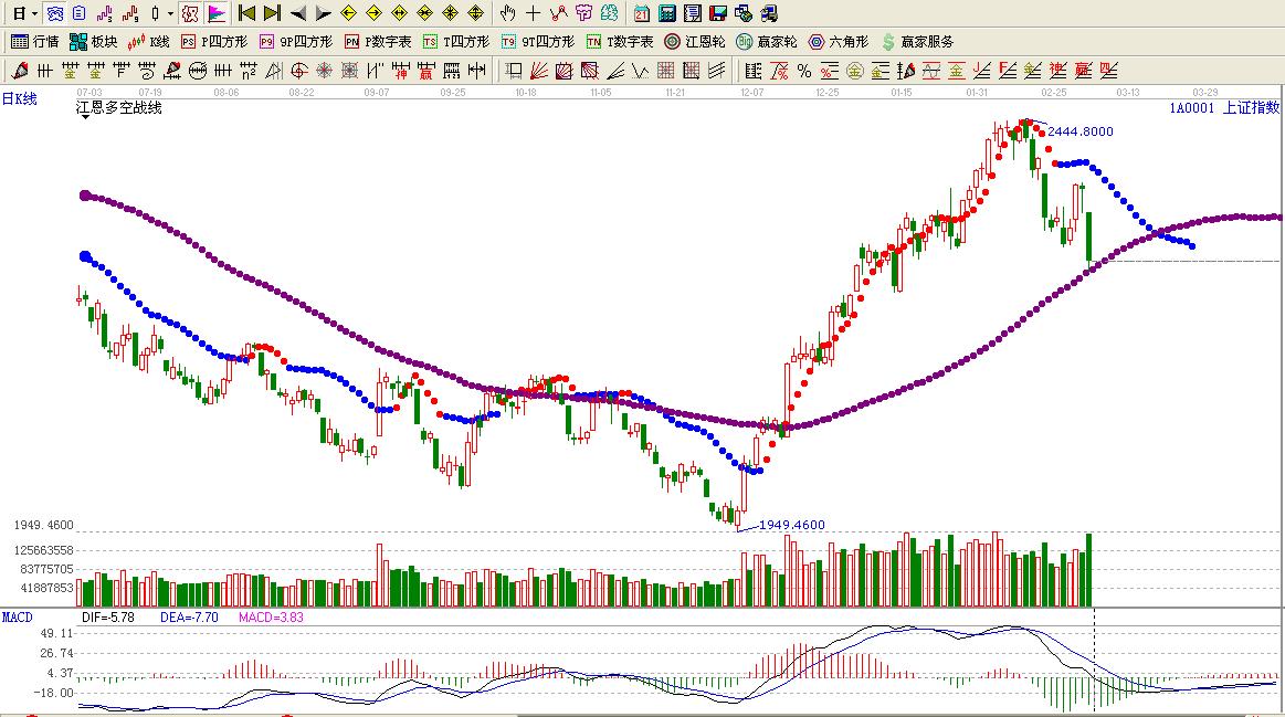 ★依據(jù)贏家江恩多空戰(zhàn)線提示:目前大盤運(yùn)行在長期紫色多空線附近,短期藍(lán)色線上方,謹(jǐn)慎做多。