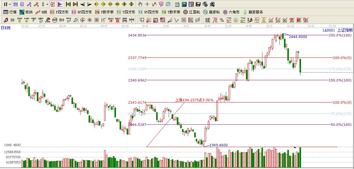 ☆依據(jù)贏家波段百分比延伸線提示:大盤消息影響低開破位0度位置,按照百分比延伸線用法,跌破一線看低一線,短期270度位置2290附近壓力,下方支撐180度位置2240附近。
