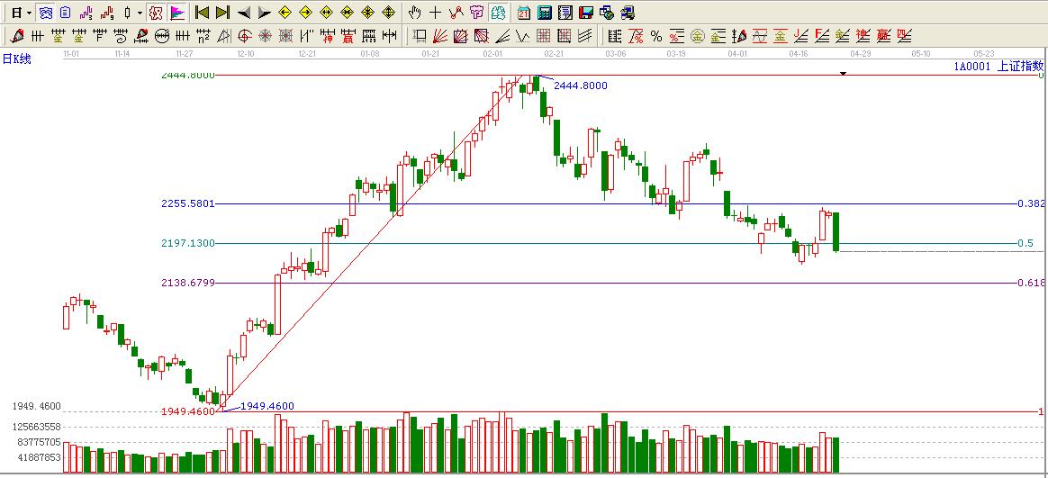 ☆依據黃金價格回調支撐位提示:大盤一個光禿禿的陰線再度跌破0.5位置2197點,短期這里構成壓力。下方考驗2165.78點的支撐力度。