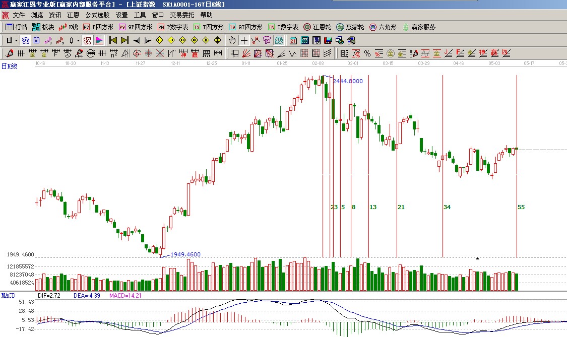 ★依據(jù)費(fèi)氏時(shí)間周期線提示:以2444點(diǎn)時(shí)間為起點(diǎn)做圖如圖(3),5月13號為時(shí)間窗;