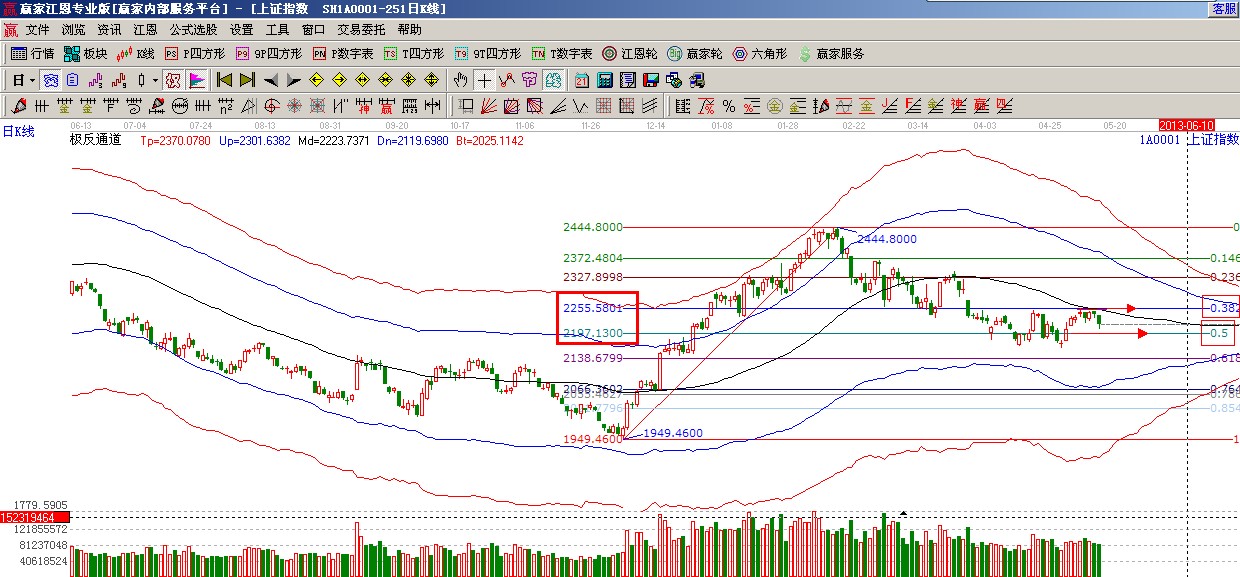 ★依據黃金分割提示:2255點(0.382)下方震蕩4天低開一路下行,支撐(0.5)2197點,突破一線看高一線,失守一線看低一線如圖(2);