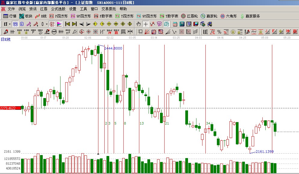 ★依據費氏時間周期線提示:以2444點時間為起點做圖如圖(3),5月13號為時間窗;