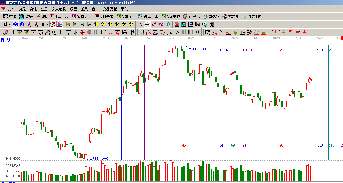 ☆依據(jù)黃金時(shí)間周期線提示:從1949點(diǎn)至2444點(diǎn)做時(shí)間圖(3),5月23號(hào)為時(shí)間窗;