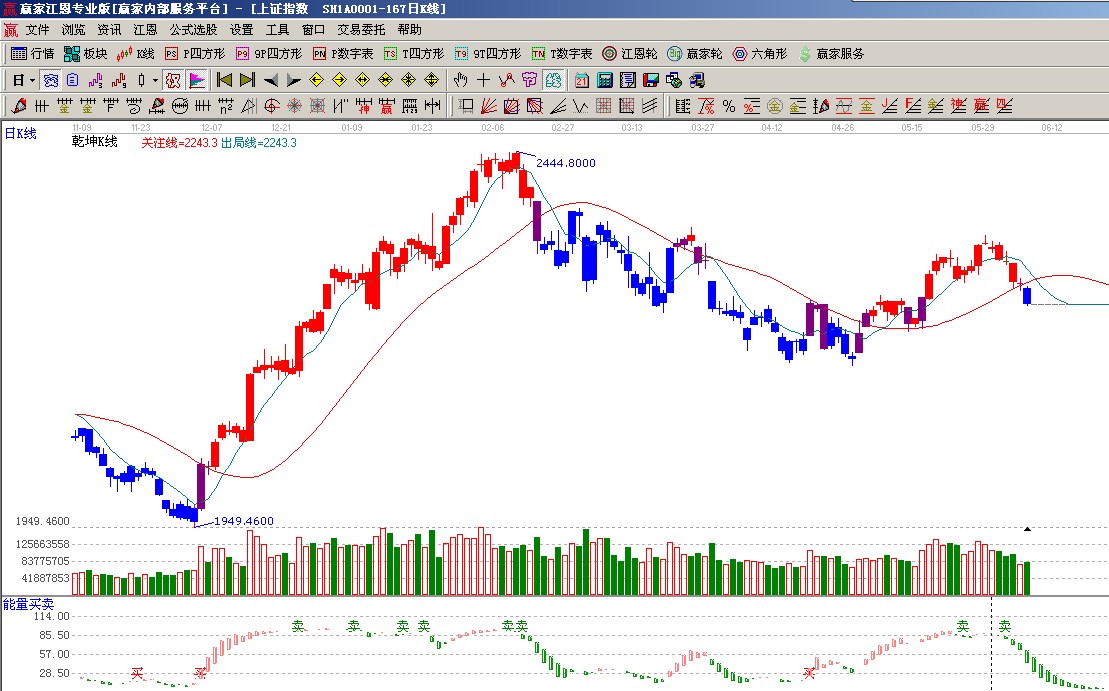 ☆依據贏家江恩系統乾坤K線提示:失守關注線K線顏色變成藍色,進入休息區看空,短期市場會對關注線進行反抽確認如圖(1);