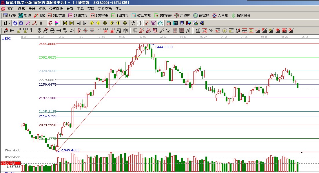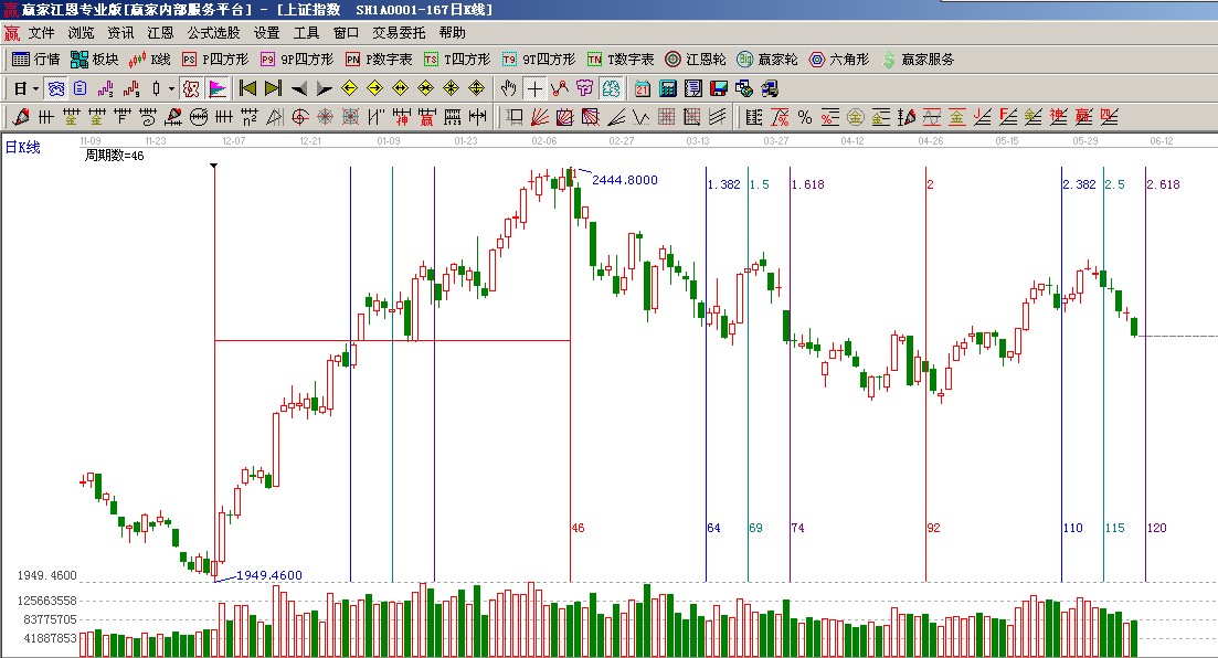 ★依據贏家江恩系統黃金時間周期線提示:從1949點至2444點做時間圖(3),6月7號為時間窗;