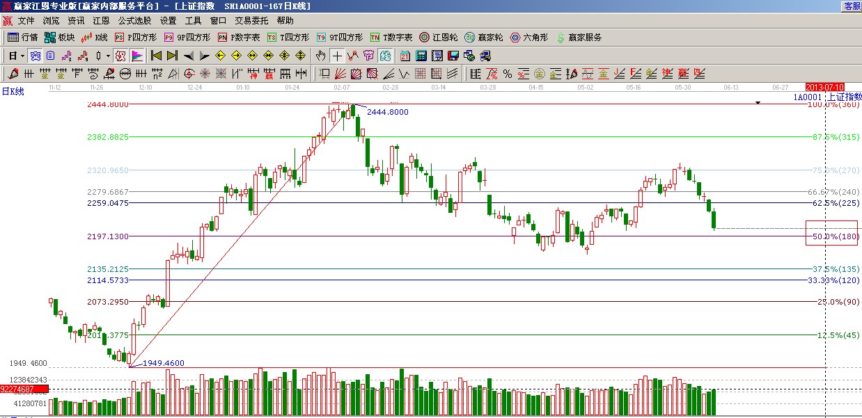 ★依據(jù)贏家江恩系統(tǒng)波段百分比提示:180度支撐2197點(diǎn)是當(dāng)前指數(shù)的支撐位,進(jìn)入前期震蕩箱體指數(shù)下跌有望轉(zhuǎn)為震蕩,如圖(2);