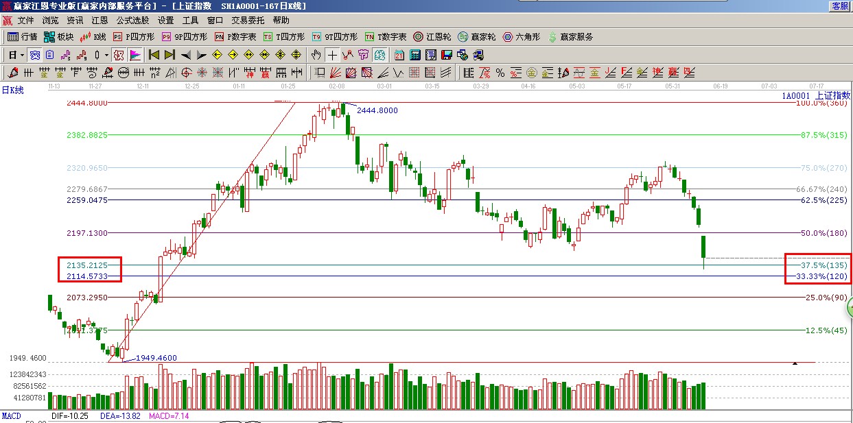 ★依據贏家江恩系統波段百分比提示:120度與135度(2114-2135)構成指數當前支撐帶,180度(2197)與缺口枃成阻力帶,市場有望在江恩波段百分比震蕩帶出現止跌,如圖(2);