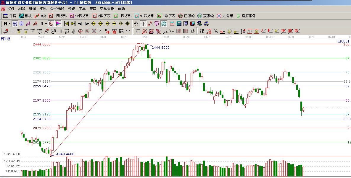 ★依據贏家江恩系統波段百分比提示:120度與135度(2114-2135)構成指數當前支撐帶,180度(2197)與缺口枃成阻力帶,市場有望在江恩波段百分比震蕩帶出現止跌,如圖(2);