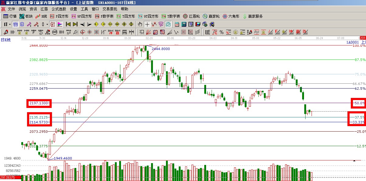 ★依據(jù)贏家江恩系統(tǒng)波段百分比提示:120度與135度(2114-2135)構(gòu)成指數(shù)當(dāng)前支撐帶,180度(2197)與缺口枃成阻力帶,市場(chǎng)有望在江恩波段百分比震蕩帶出現(xiàn)止跌,如圖(2);